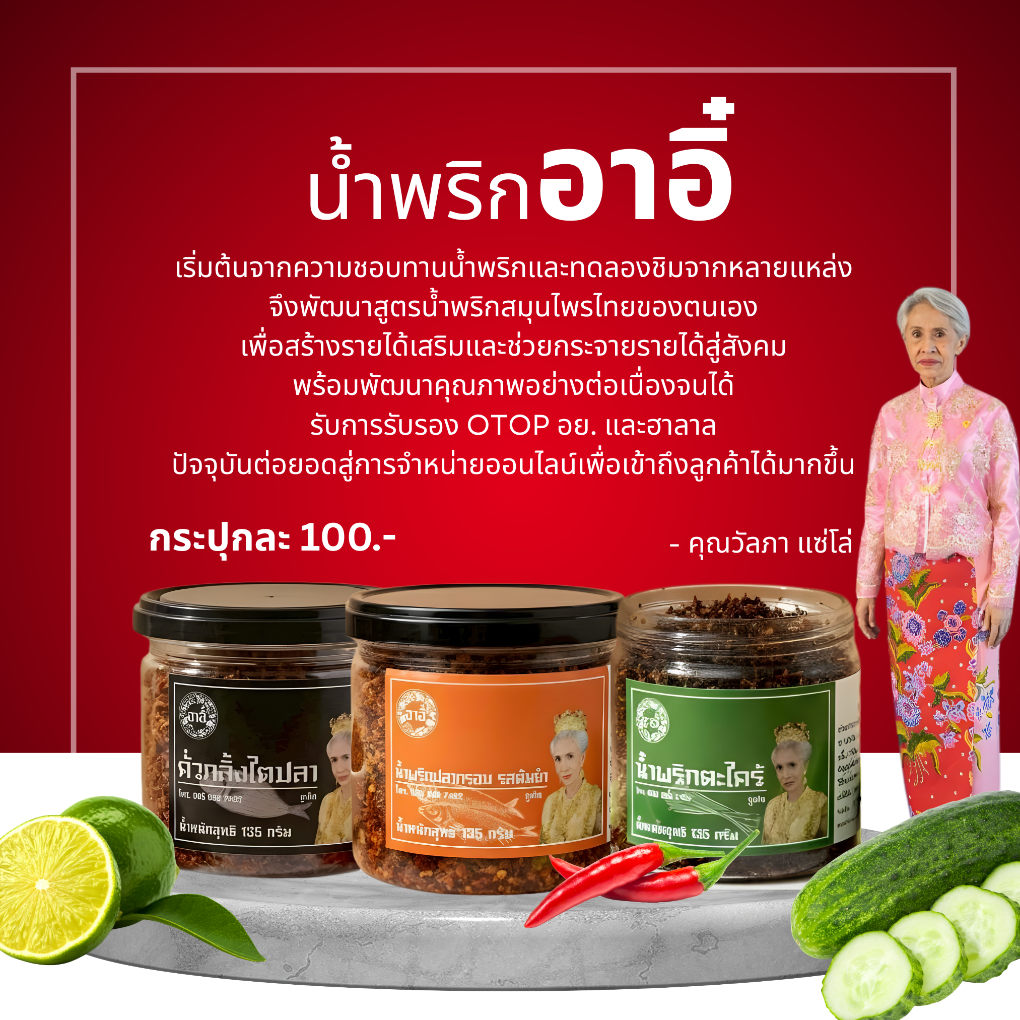 It started from a love of eating chili paste and trying flavors from many different places.Therefore, they developed their own recipe for Thai herbal chili paste.To generate supplementary income and help distribute income to the community.We are committed to continuously improving the quality until we achievecertified OTOP, FDA, and Halal. Currently, they are expanding into online sales to reach more customers. - Ms. Walapha Sae Lo